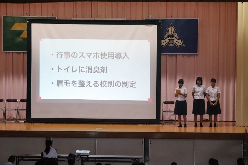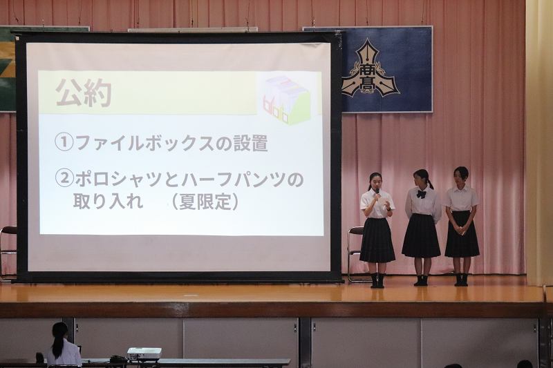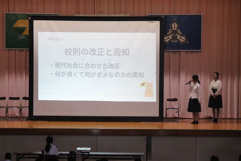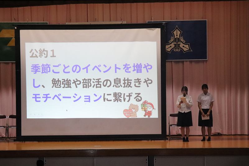 で、各立候補者がよりよい宮商にするために、有権者(生徒)への呼びかけを行いました。