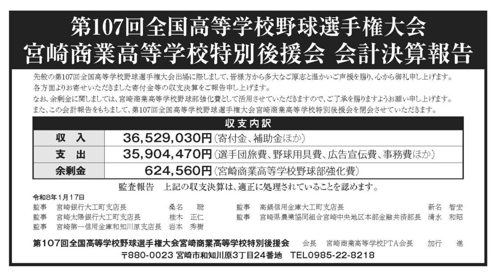また、この会計報告をもちまして、第107回全国高等学校野球選手権大会宮崎商業高等学校特別後援会を閉会させていただきます。